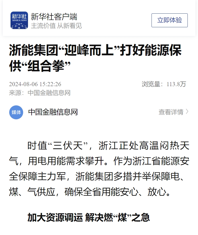 新華社客戶端、新華財經客戶端報道《打好迎峰度夏“組合拳” 浙能集團持續提升能源保供能力》。