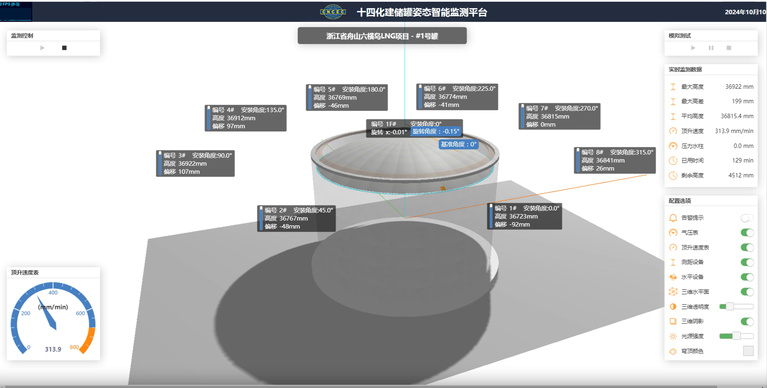 為確保“鋼帽”升起均衡平穩(wěn),浙能舟山六橫LNG接收站使用了“硬核科技”——數(shù)智化頂升系統(tǒng)。該系統(tǒng)主要依托遍布罐體的“神經(jīng)”——傳感器,實(shí)時收集風(fēng)壓、平衡鋼絲繩的拉力值以及頂升方位和速度等信息,并通過三維可視化智控軟件,實(shí)現(xiàn)風(fēng)壓智能控制、拱頂智能配重、頂升方位智能糾偏等功能,大幅減少了人工操作可能帶來的誤差,讓整個氣頂升過程精準(zhǔn)、智能、安全。