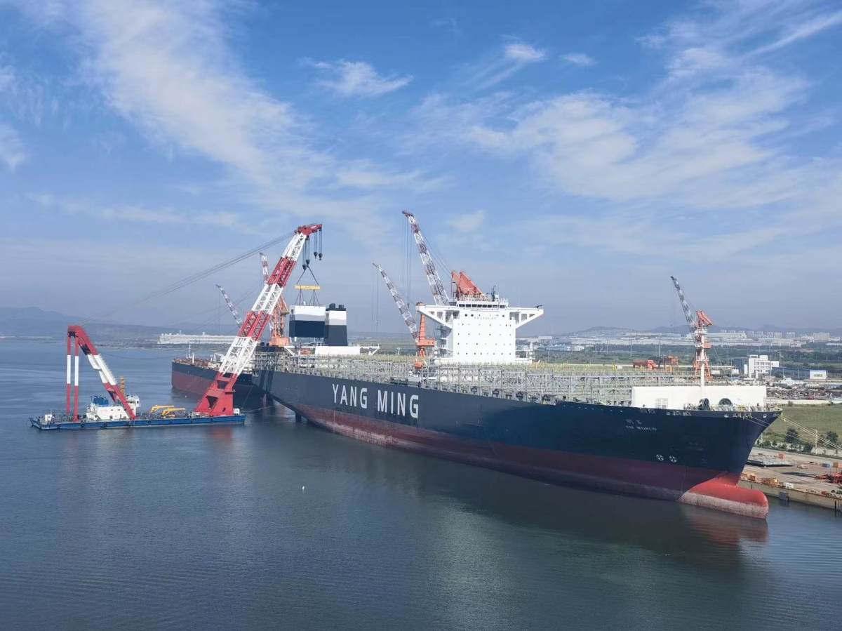 浙能邁領(lǐng)公司在船廠為船東吊裝脫硫塔裝置。 浙能邁領(lǐng) 提供