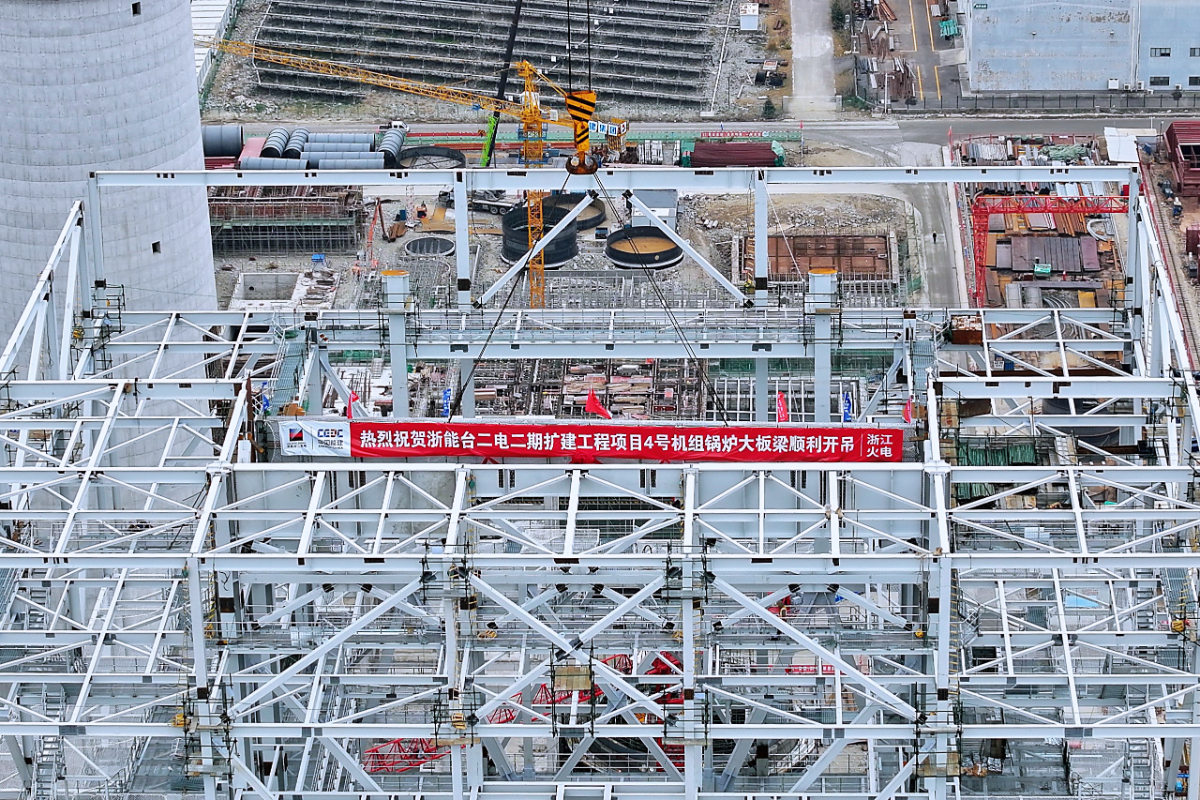 高質(zhì)量發(fā)展看“浙”里|臺二電二期擴建工程項目4號鍋爐首根大板梁吊裝就位