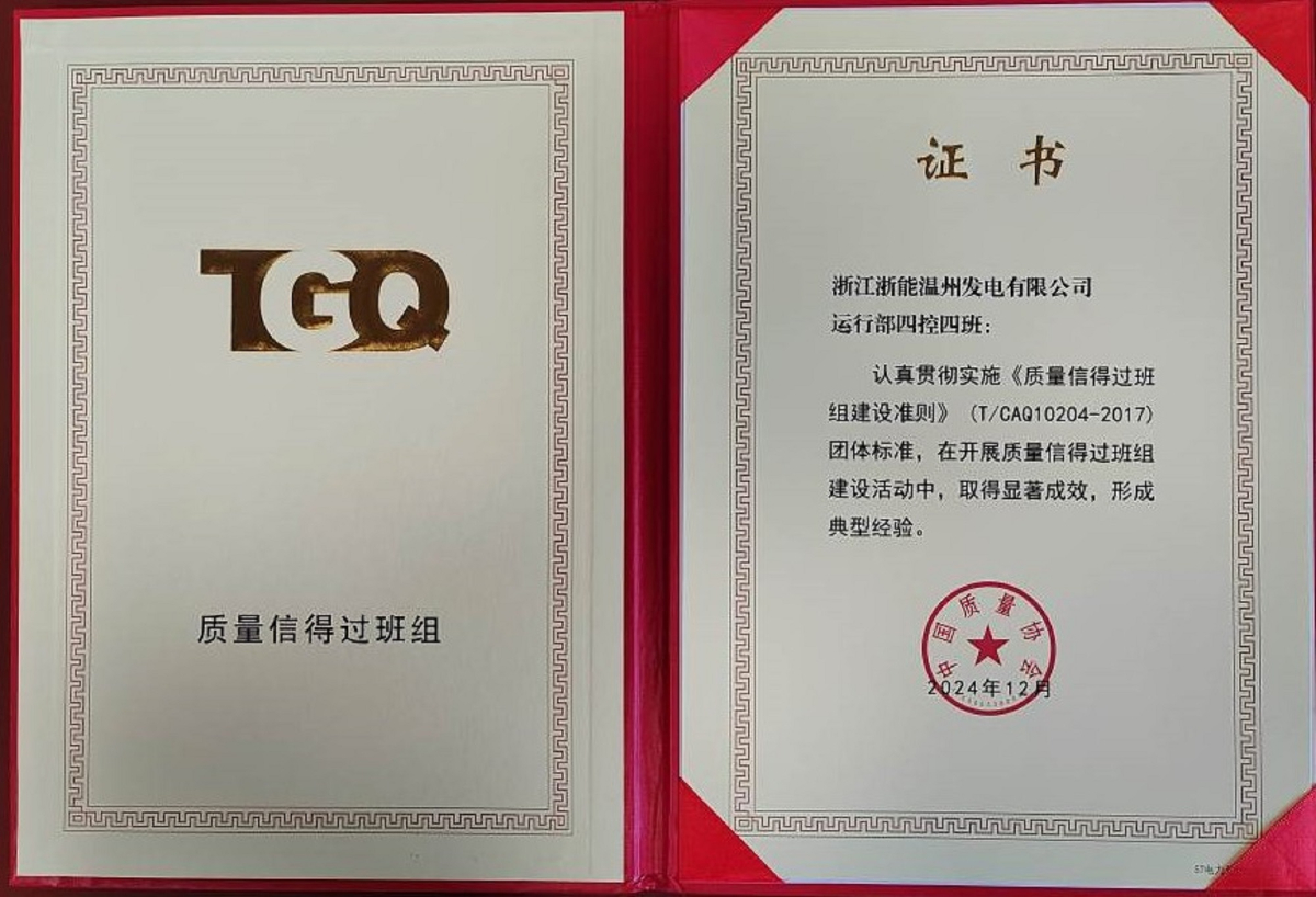 溫州發電公司運行部四控四班“全國質量信得過班組”榮譽證書。 王儷穎 攝