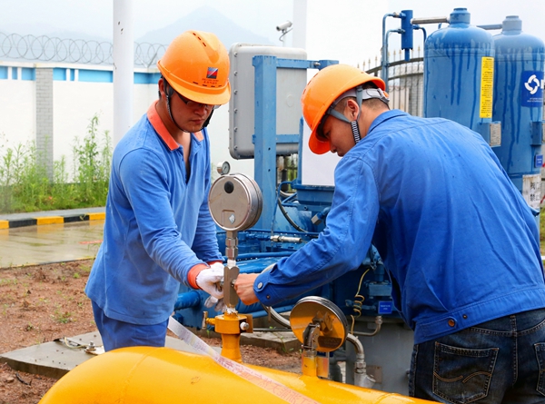 甬臺溫天然氣管線開閥后,浙能天然氣運行公司人員觀測管內壓力變化情況。鄭佳俊攝