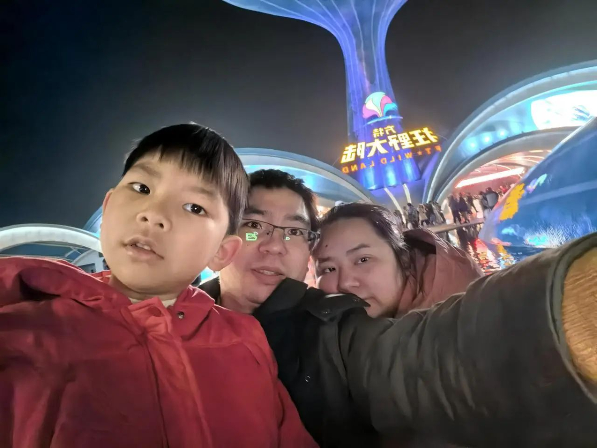 帶大兒子在臺州方特樂園游玩,中間為張勤,右為張勤愛人。 臺二電 提供