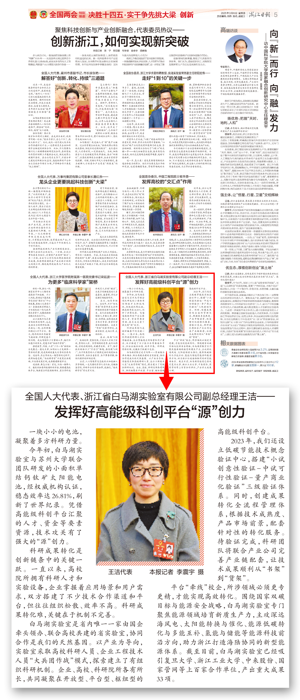 《浙江日報》全國兩會特別報道《全國人大代表、浙江省白馬湖實驗室有限公司副總經理王潔——發(fā)揮好高能級科創(chuàng)平臺“源”創(chuàng)力》。 浙江日報 圖