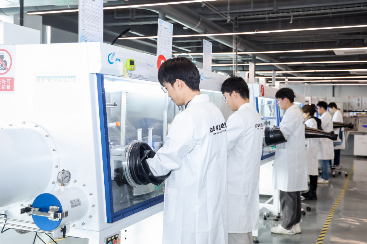白馬湖實驗室科研人員在進行電極材料成膜與軟包實驗。 白馬湖實驗室 提供