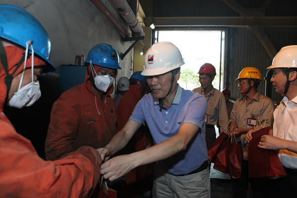 呂美溪、許強一行首先來到3號爐磨煤機檢修現場,看到奮戰在高溫下的嘉電人,疾步上前遞上清涼用品,并殷切囑咐道:“大家辛苦了,天氣炎熱,大家要注意身體、注意安全!”叮囑在場的部門負責人要注意職工身體情況,多輪班。隨后,呂美溪、許強一行來到“中國首臺超低排放機組”控制室,與精心操作的運行人員一一握手,送上清涼用品。