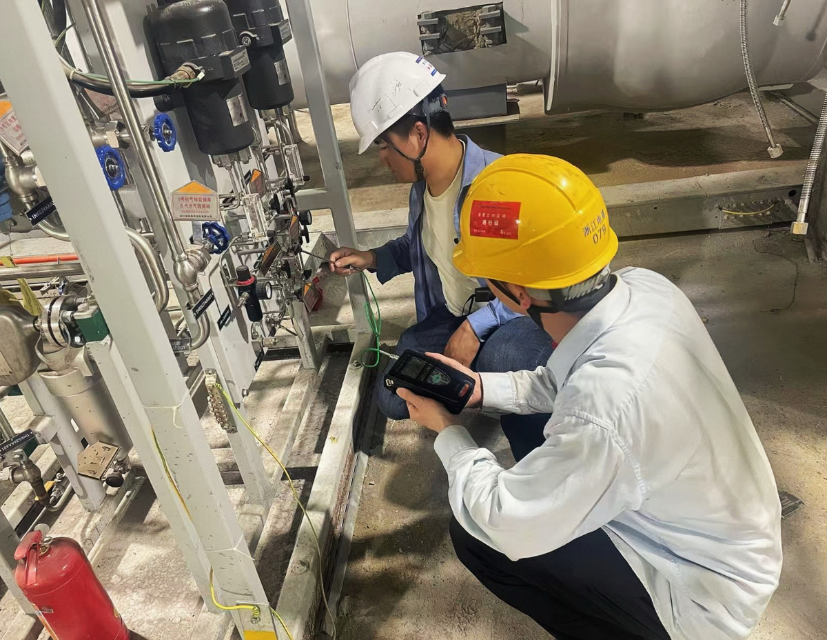 發(fā)電機(jī)氫氣系統(tǒng)查漏小隊(duì)成員拿著氫氣檢漏儀仔細(xì)排查各可疑漏點(diǎn)設(shè)備。 龔嘉沫 提供