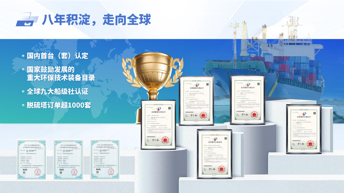 浙能邁領(lǐng)作為浙能集團(tuán)綠色航運(yùn)業(yè)務(wù)的重要平臺,依托浙能集團(tuán)國家技術(shù)發(fā)明獎一等獎超低排放技術(shù)及相關(guān)基礎(chǔ)研究,持續(xù)推動船舶環(huán)保技術(shù)的創(chuàng)新與工程轉(zhuǎn)化。面向國際海事組織“限硫令”帶來的行業(yè)需求,公司逐步創(chuàng)新迭代船舶脫硫技術(shù):攻克形成了海水鎂基二氧化硫吸收強(qiáng)化技術(shù)、緊湊型高效洗滌塔等一批科研成果,研發(fā)出了全國首套混合式船舶脫硫系統(tǒng),并獲得全球九大船級社的運(yùn)行認(rèn)證。
