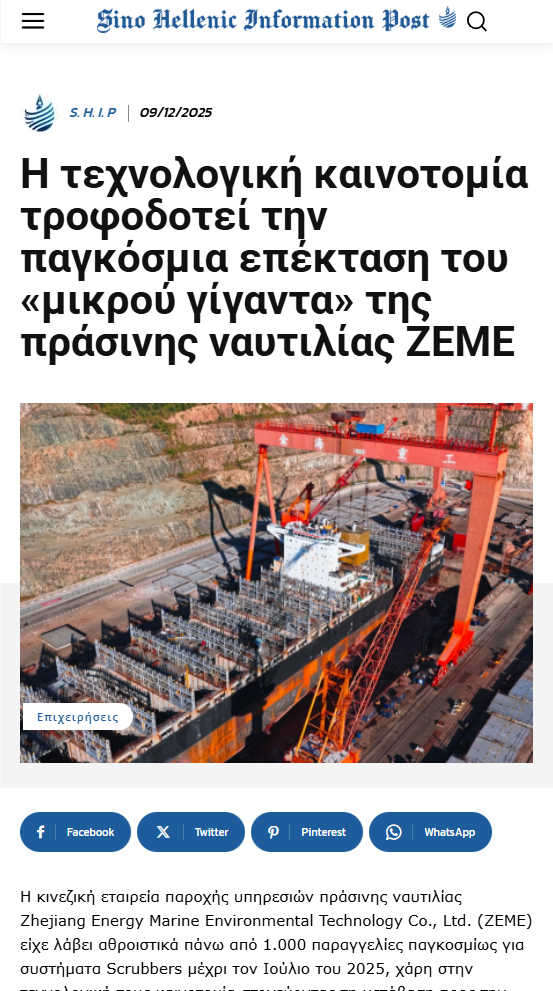 12月9日,中希信息互聯平臺(Sino-Hellenic Information Post)報道浙能邁領推動“綠色航運裝備”走向世界。 中希信息互聯平臺(Sino-Hellenic Information Post) 圖