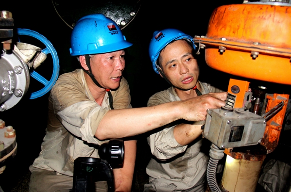 6月27日,長興發(fā)電公司檢修人員馮惠江與顧迅對(duì)3號(hào)機(jī)組溫度調(diào)節(jié)閥進(jìn)行解體檢查。趙玉寶 攝