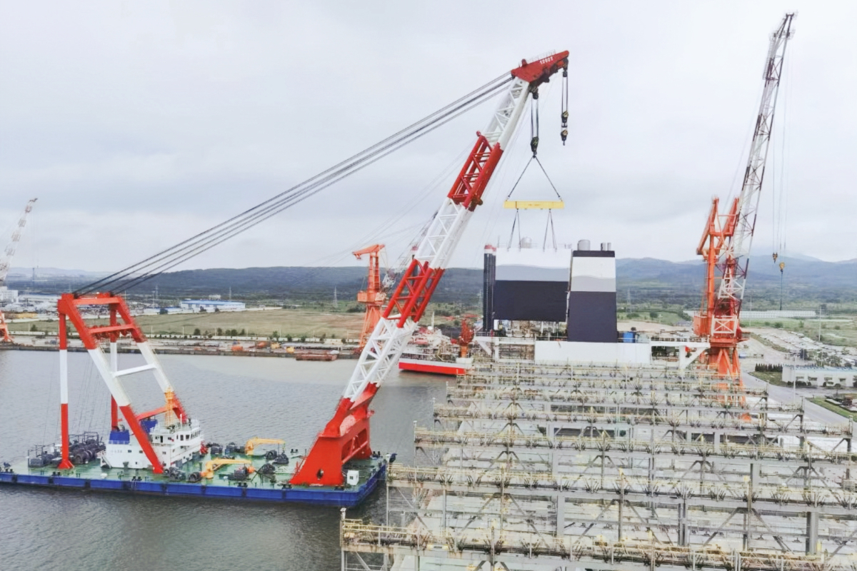 在大連長興島,浙能邁領公司首次使用大型浮吊來吊裝塔房分段。 劉顯亮 攝