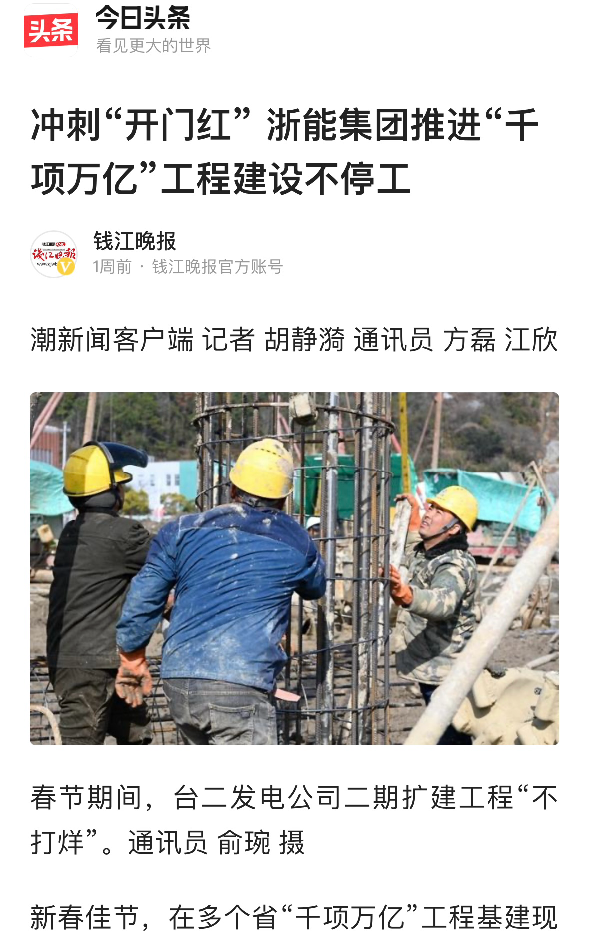 今日頭條報道《沖刺“開門紅”浙能集團(tuán)推進(jìn)“千項萬億”工程建設(shè)不停工》。 今日頭條 圖