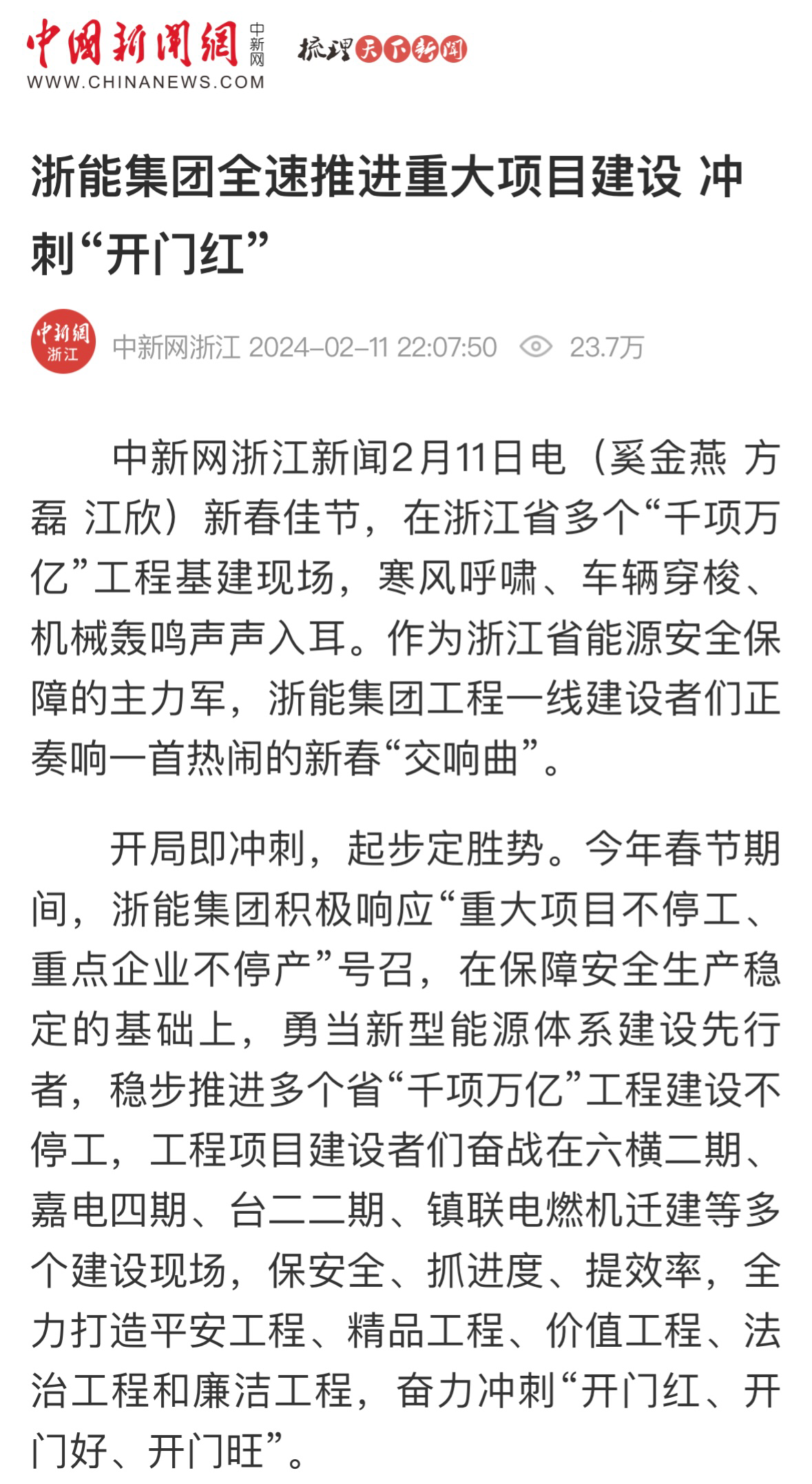 中國新聞網(wǎng)報道《浙能集團(tuán)推進(jìn)“千項萬億”工程建設(shè)不停工》 中國新聞網(wǎng) 圖